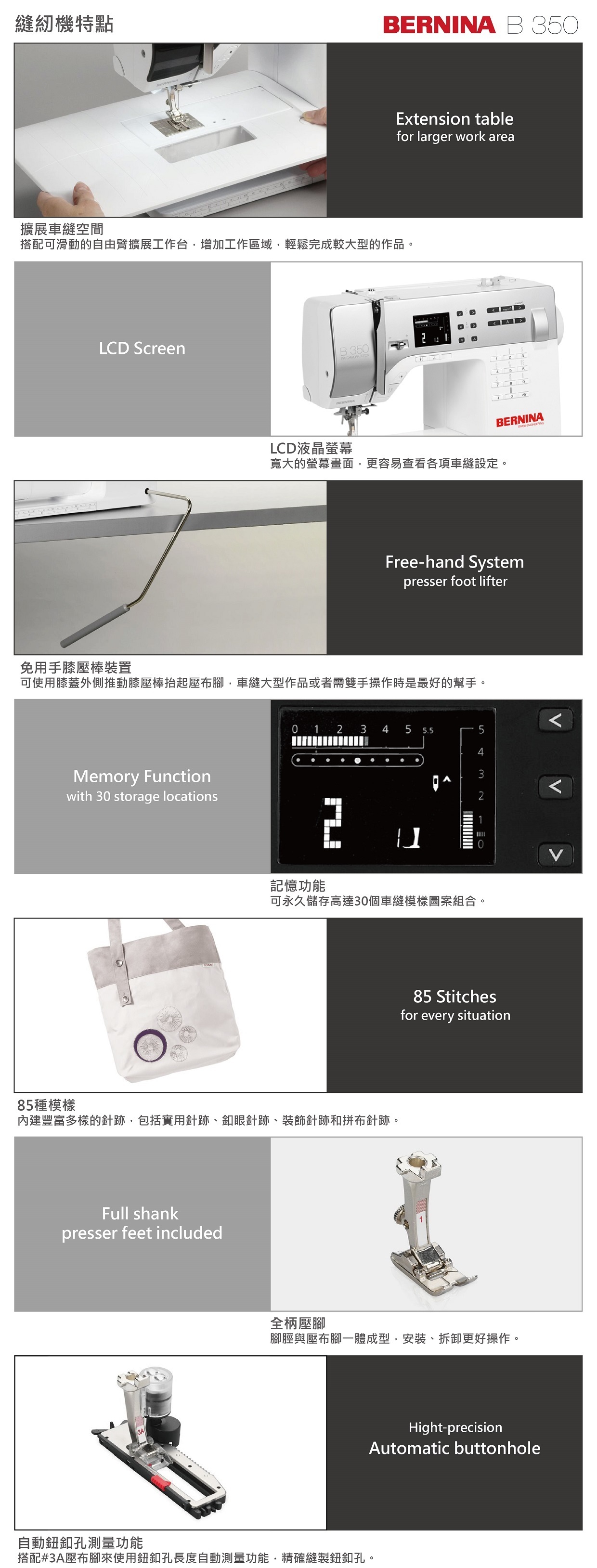 • 免用手膝壓裝置:使用膝壓棒讓您保持雙手不離開車縫區域並輕鬆抬起壓布腳。