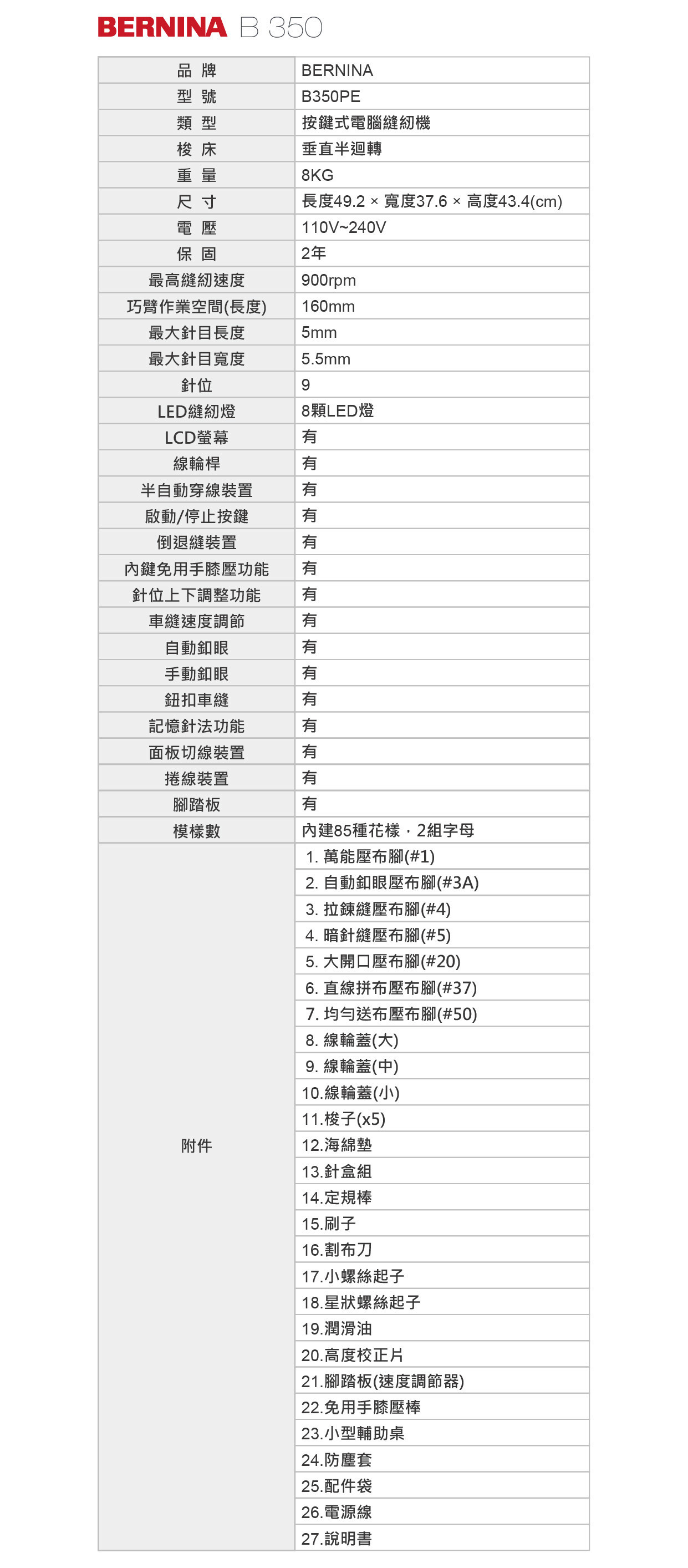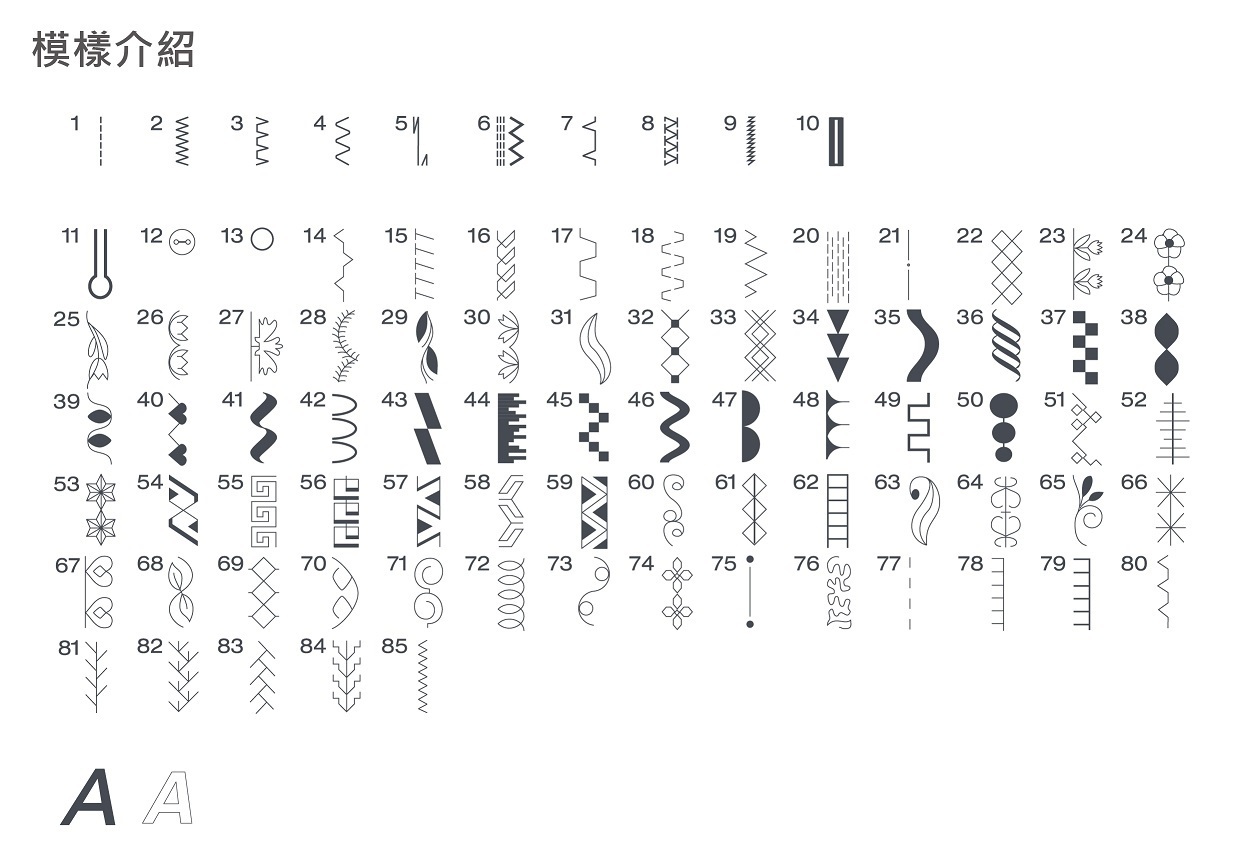 • 內建85個豐富多元的車縫模樣和兩款英文字型組合。