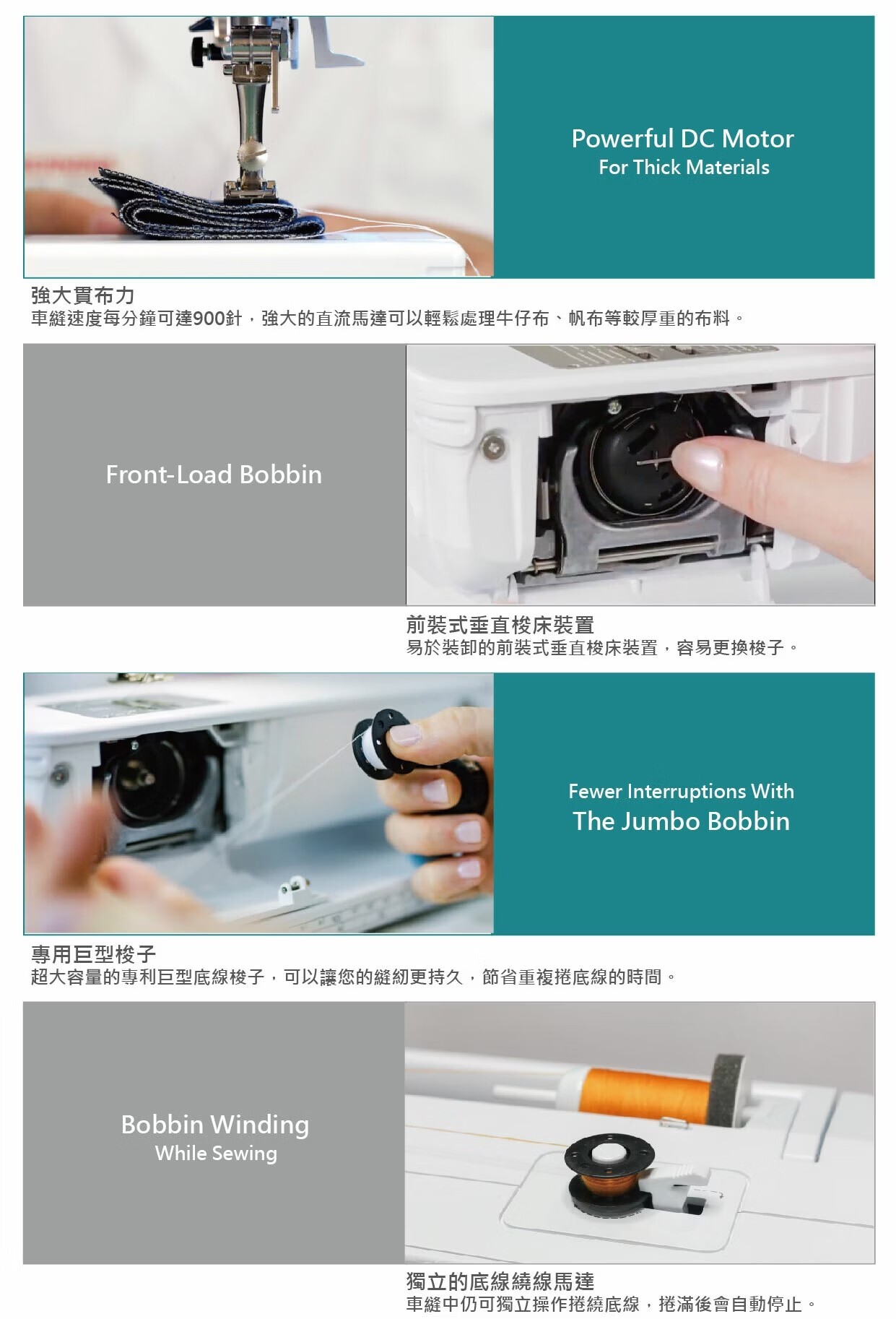 獨立的底線繞線馬達,車縫中仍可捲繞底線