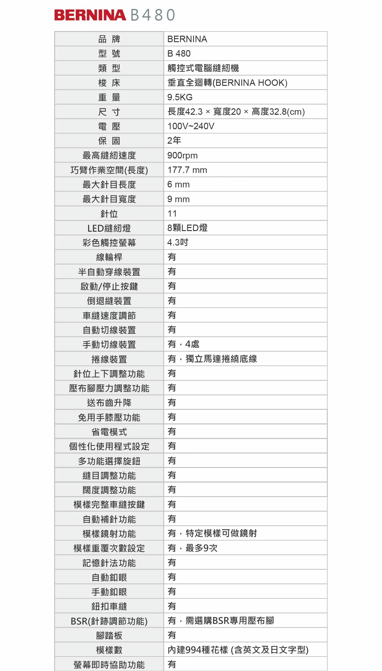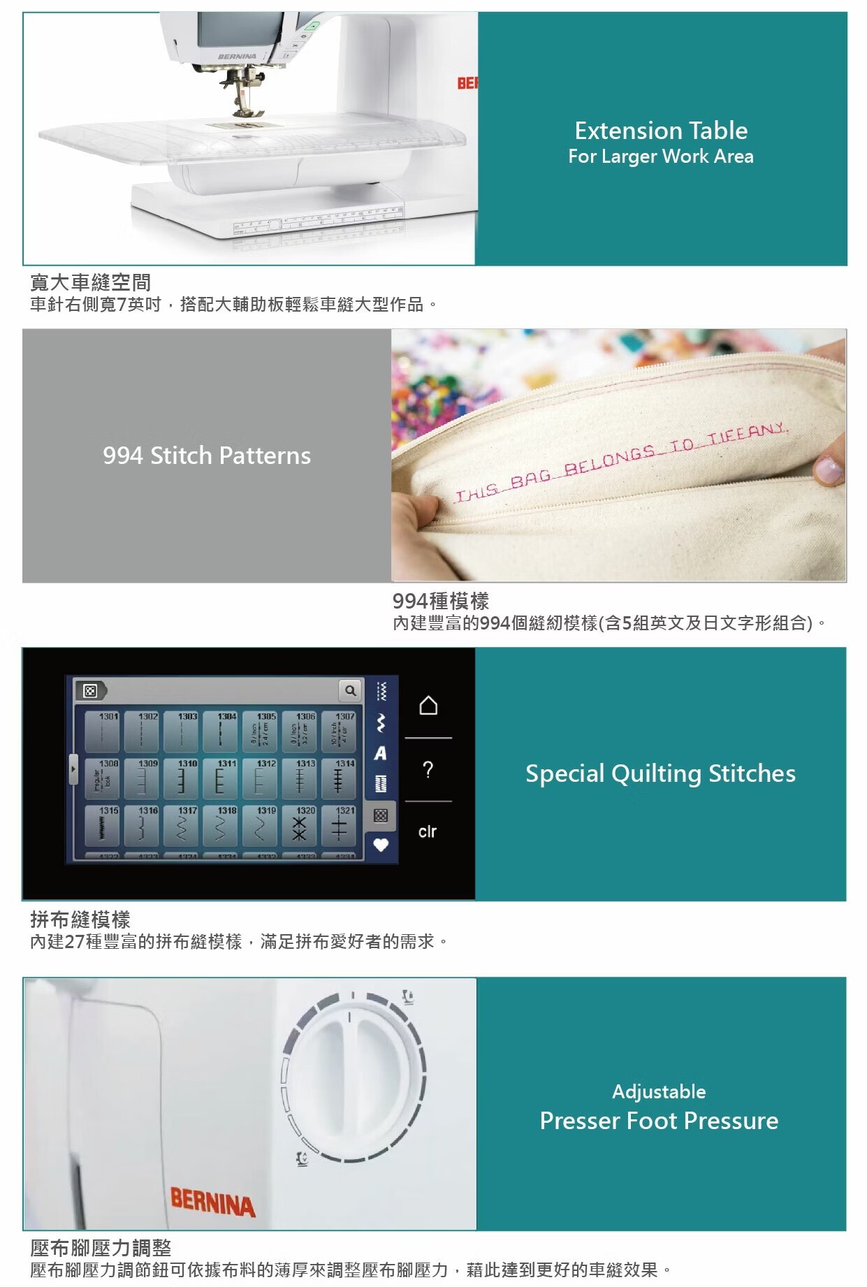 內建豐富的994個縫紉模樣(含5組文字字形組合)