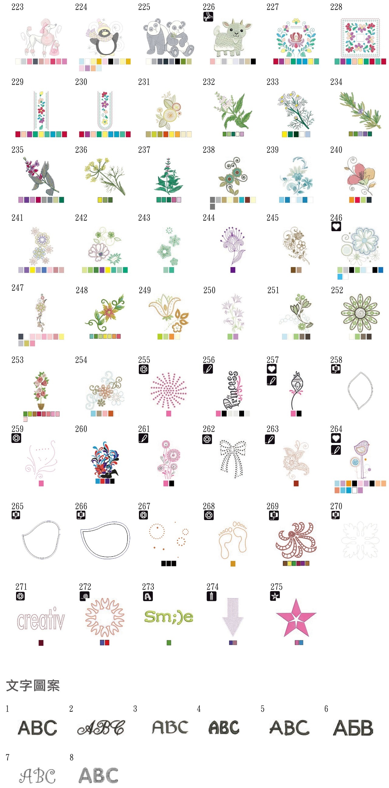 • 內建275個獨家刺繡設計/8款刺繡字型選擇。
