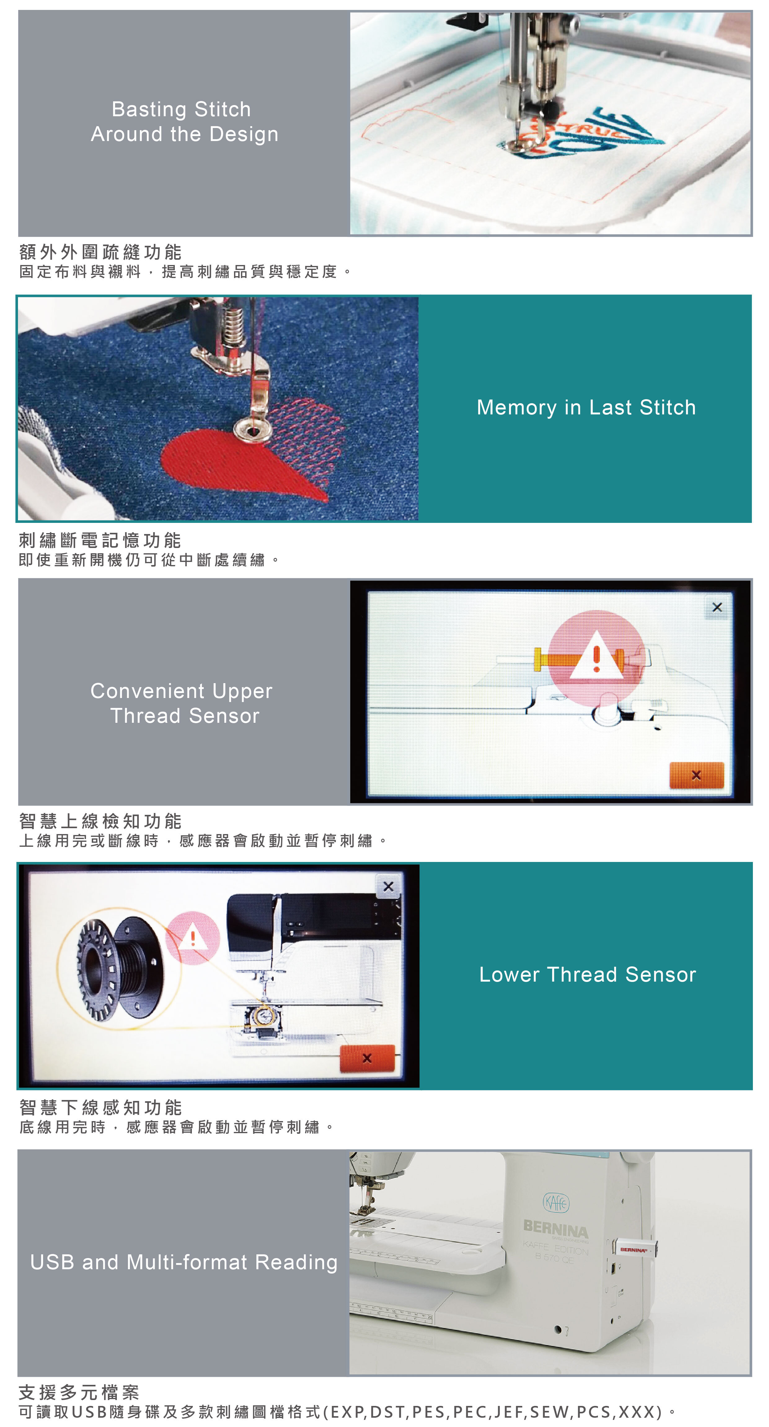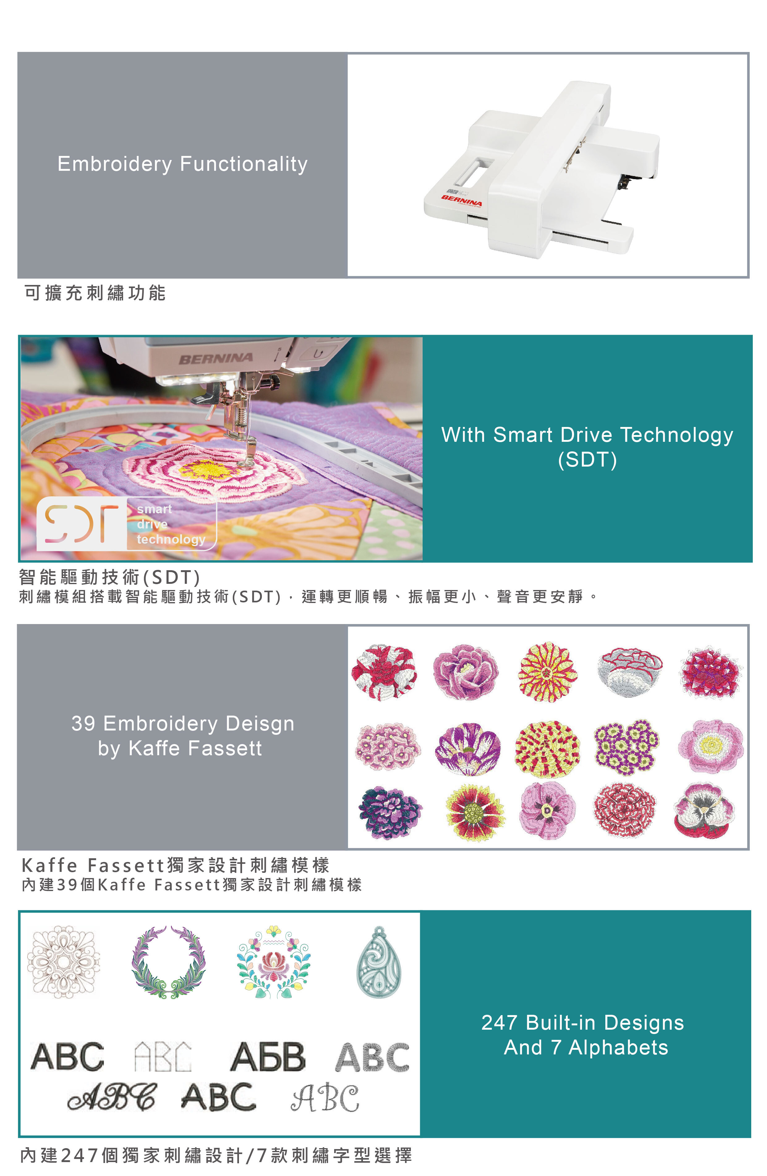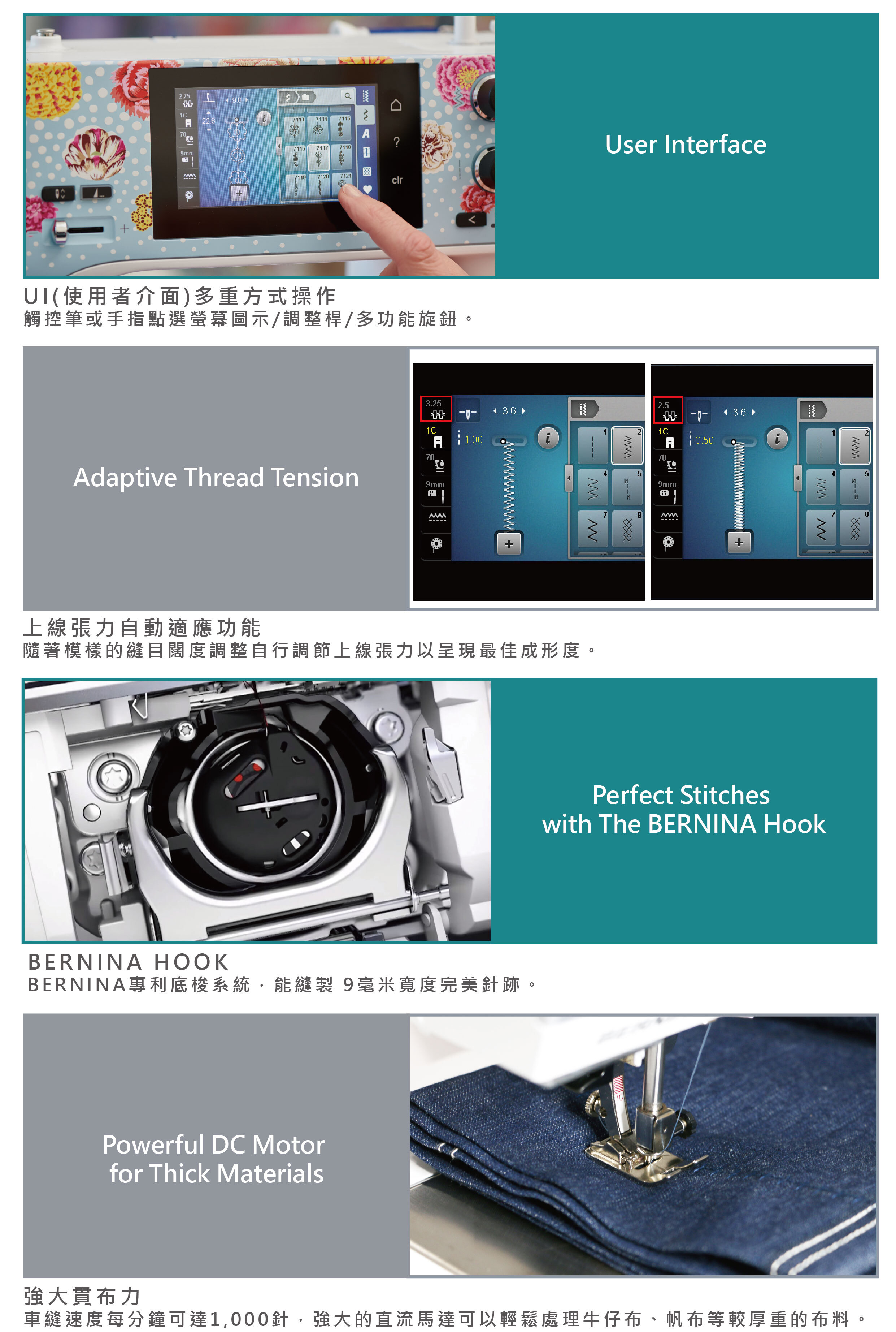• BERNINA專利底梭系統,能縫製 9毫米寬度完美針跡。