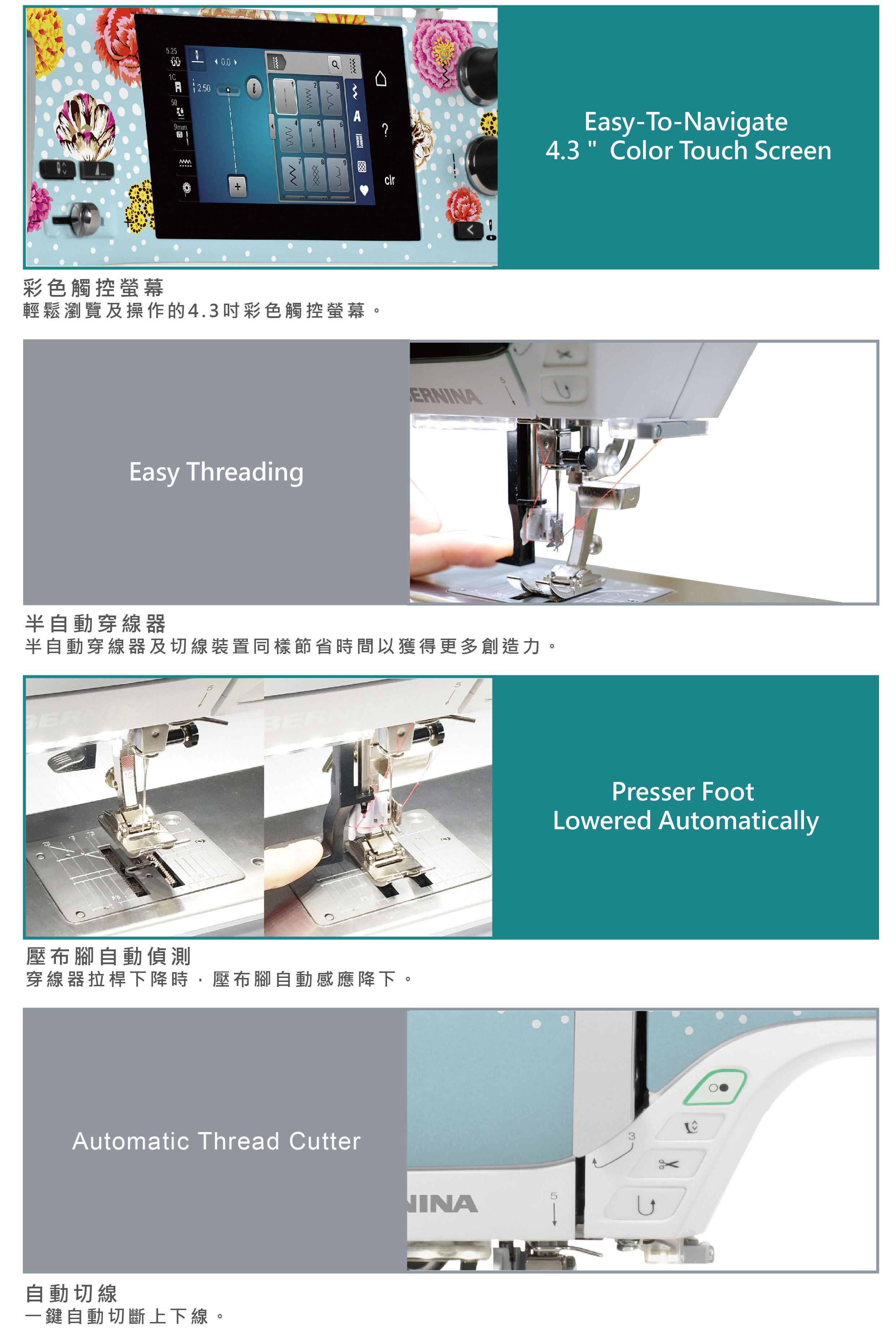 • 壓布腳自動偵測:穿線器拉桿下降時,壓布腳自動感應降下。