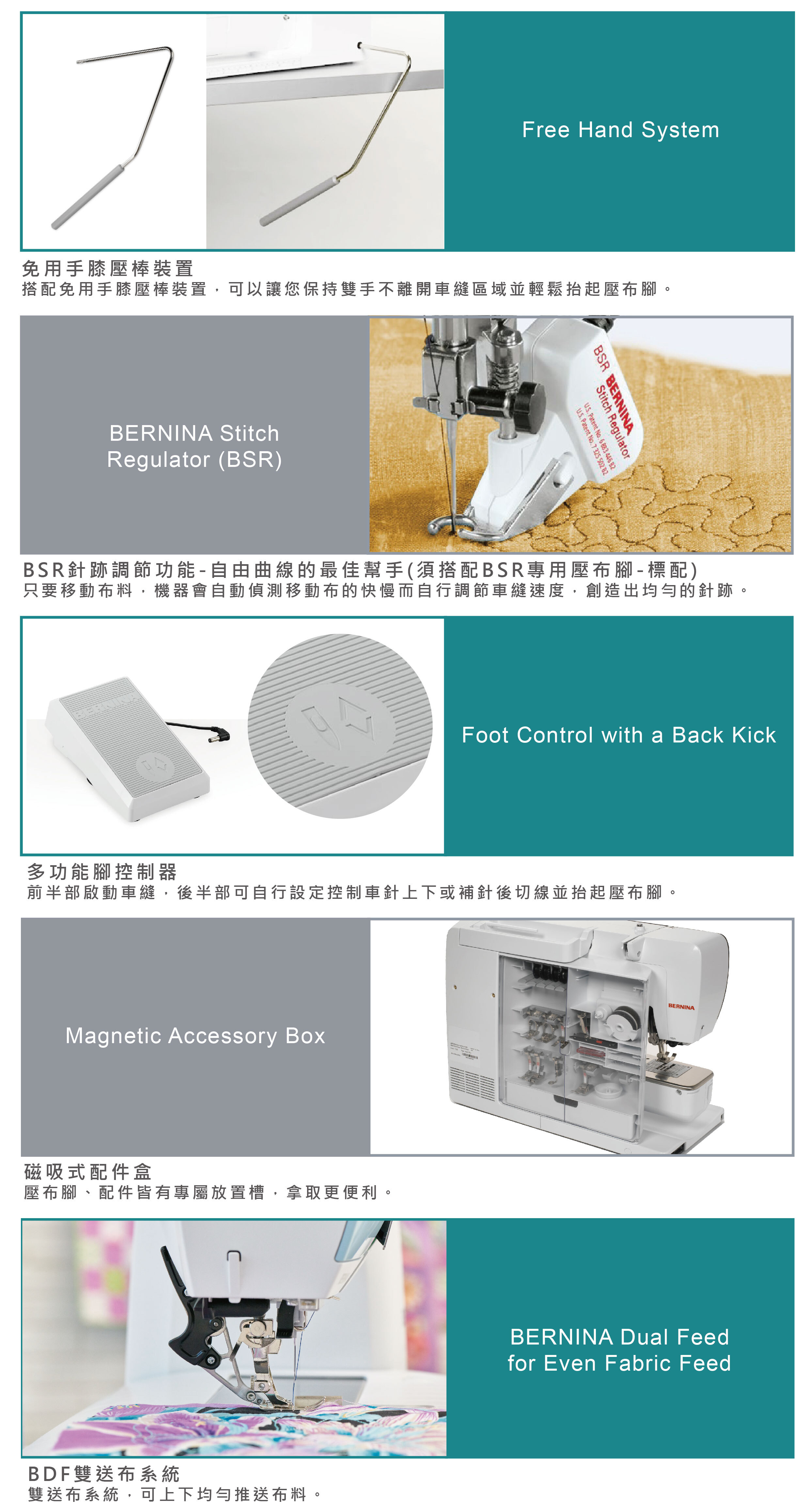 • BSR針跡調節功能:自由曲線的最佳幫手,只要移動布料,機器會自動偵測移動布的快慢而自行調節車縫速度,創造出均勻的針跡。須搭配BSR專用壓布腳。