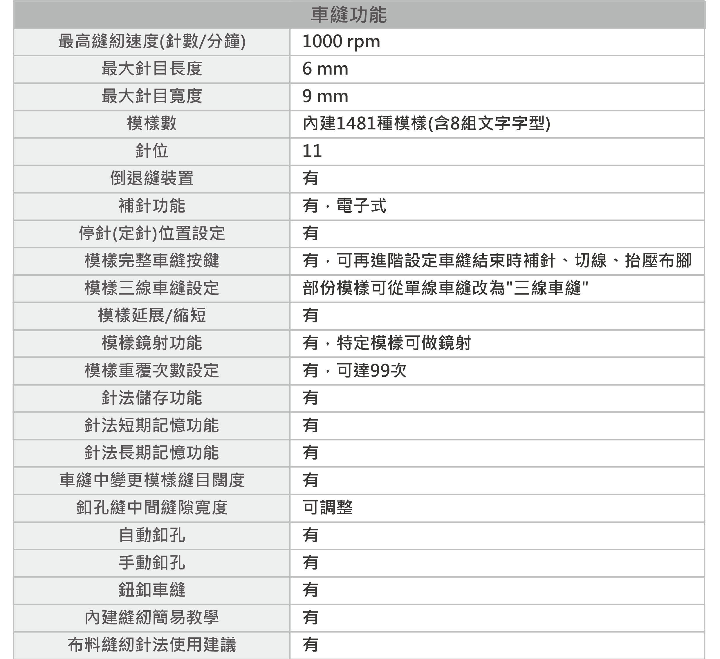 • 車縫速度每分鐘可達1,000針,強大的直流馬達可以輕鬆處理牛仔布、帆布等較厚重的布料。
