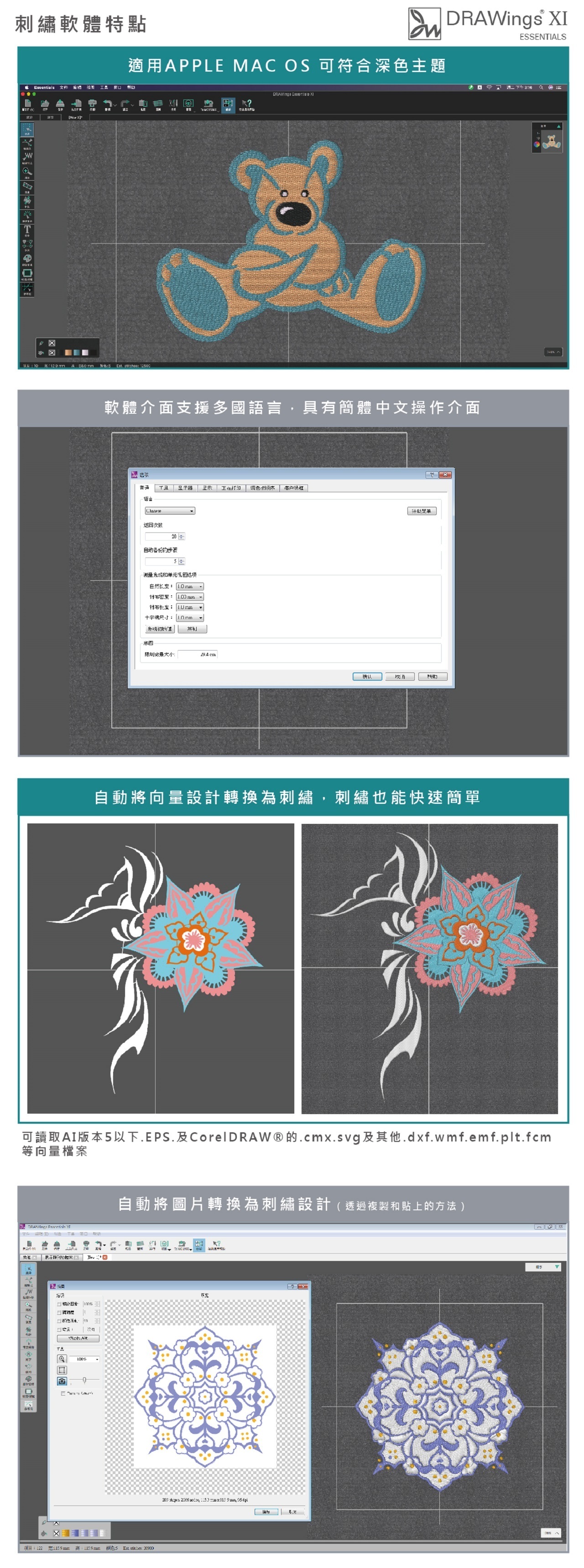 ●適用Windows/macOS系統 ●可自動將向量檔或圖片轉為刺繡圖