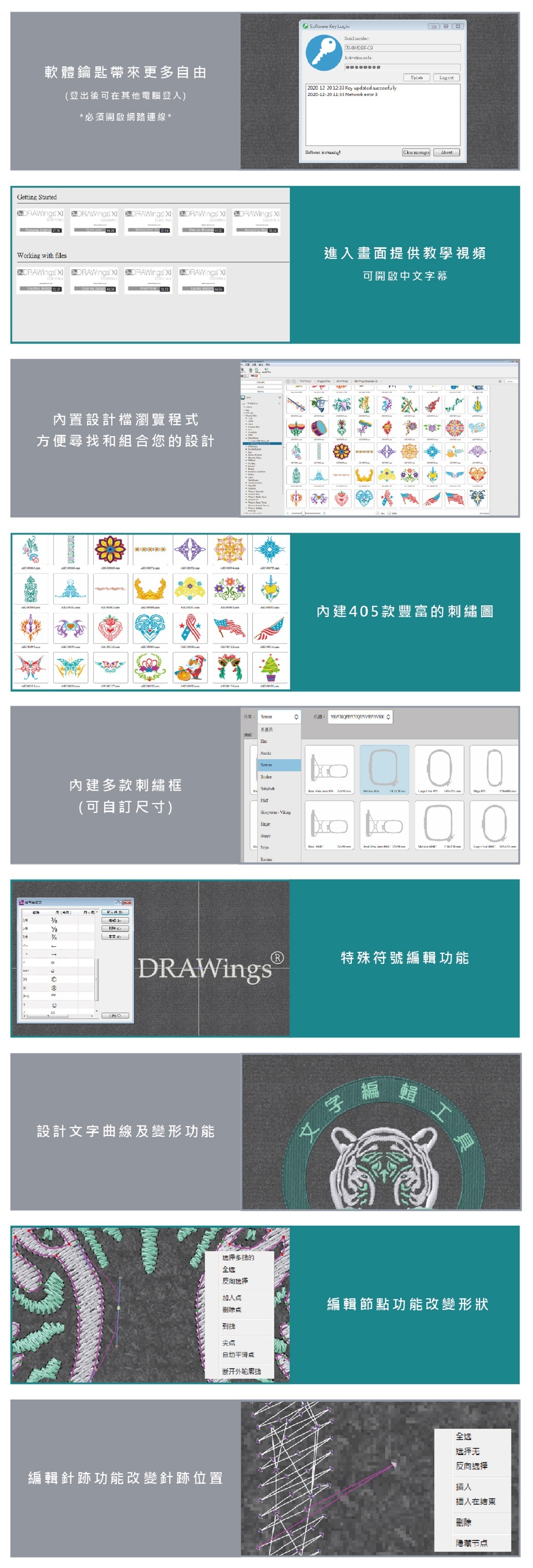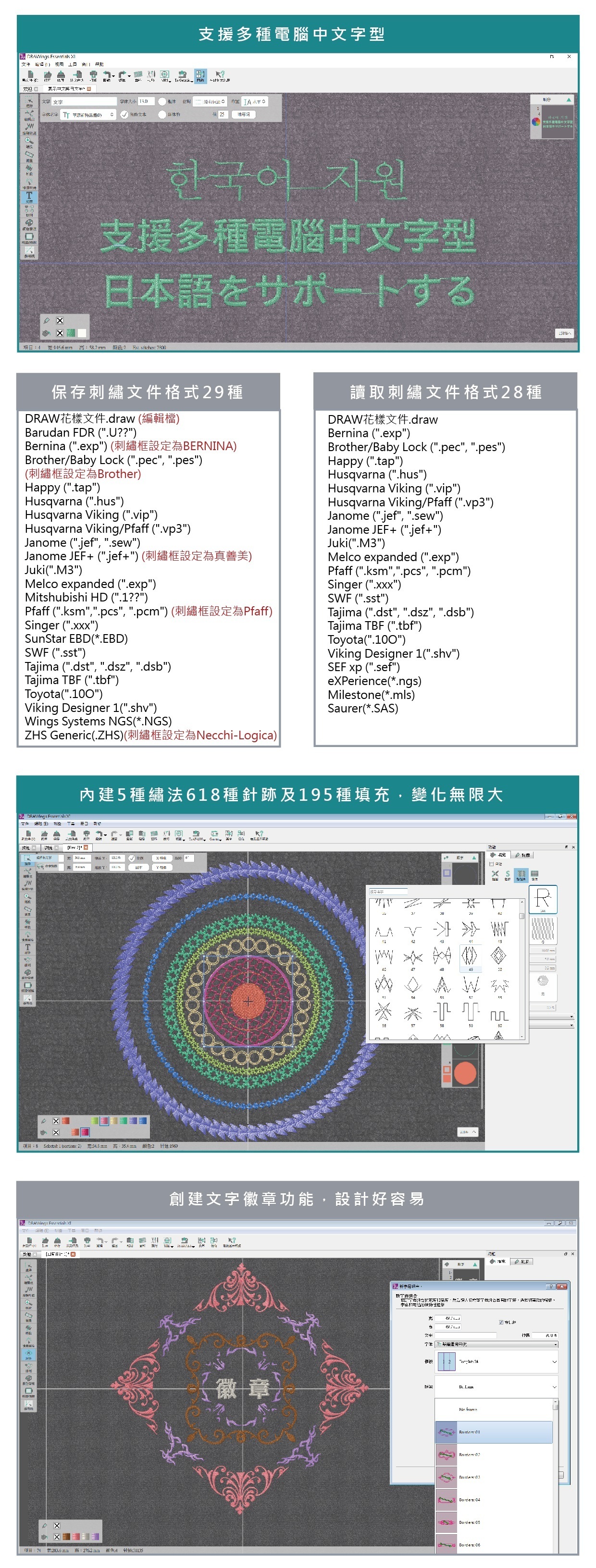 ●支援各大廠牌刺繡機 ●支援儲存、讀取多種檔案格式