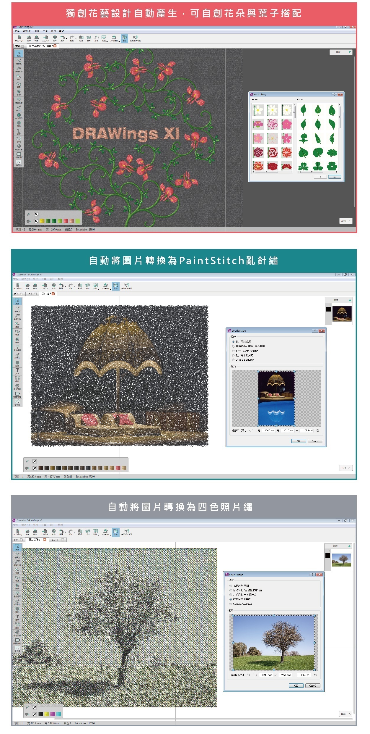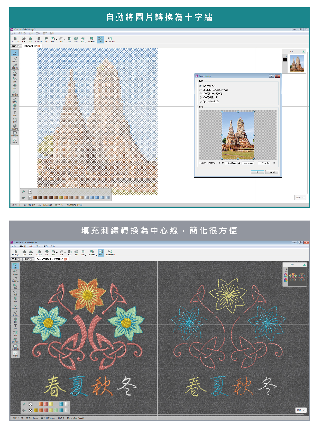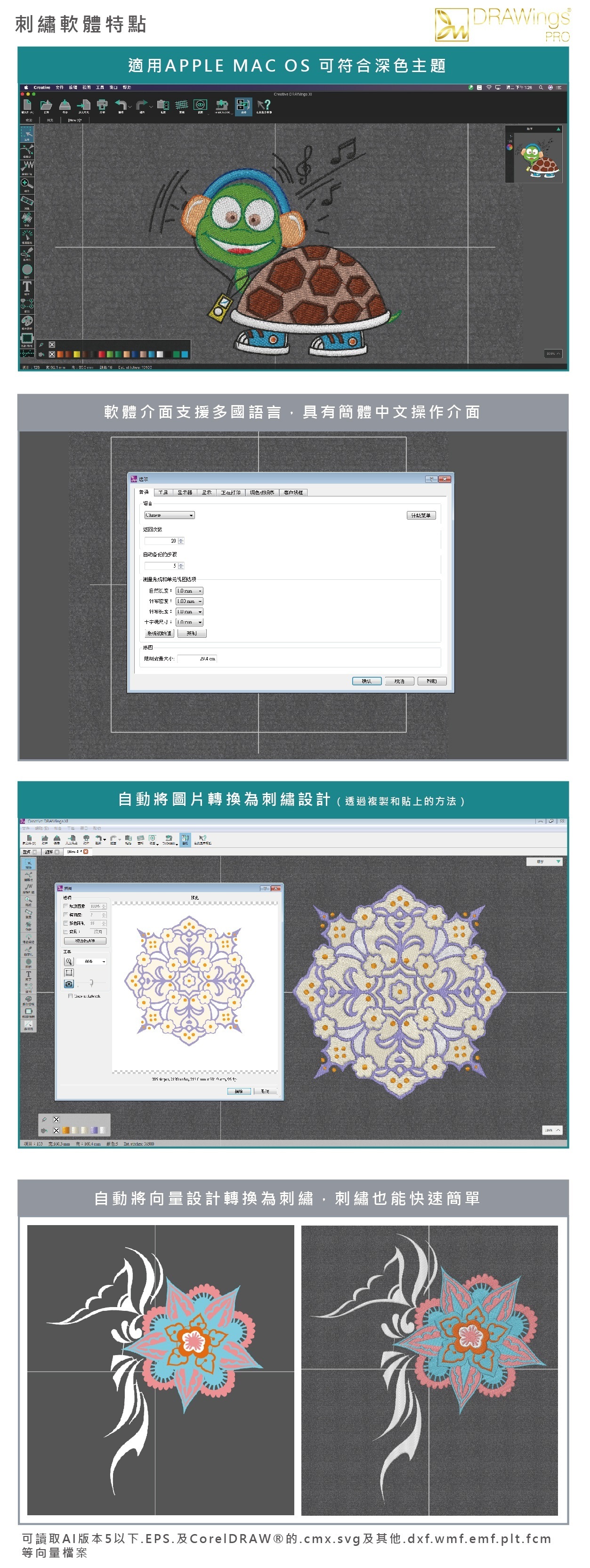 ●適用Windows/macOS系統 ●可自動將向量檔或圖片轉為刺繡圖