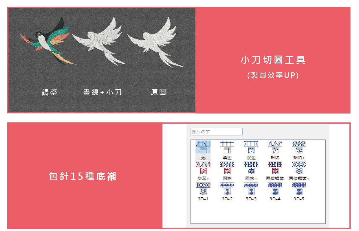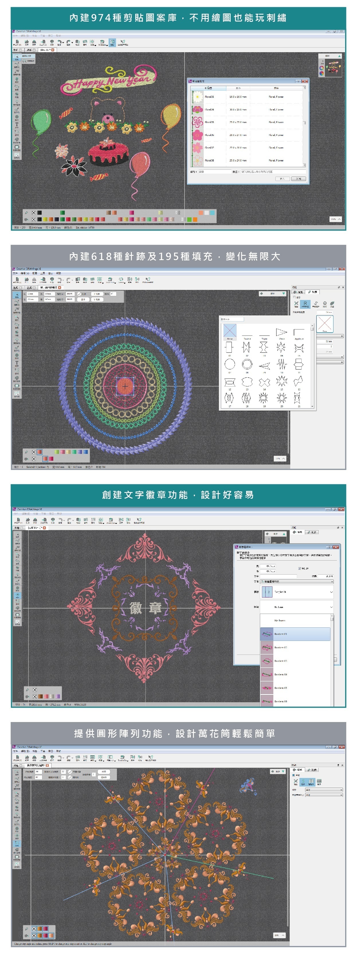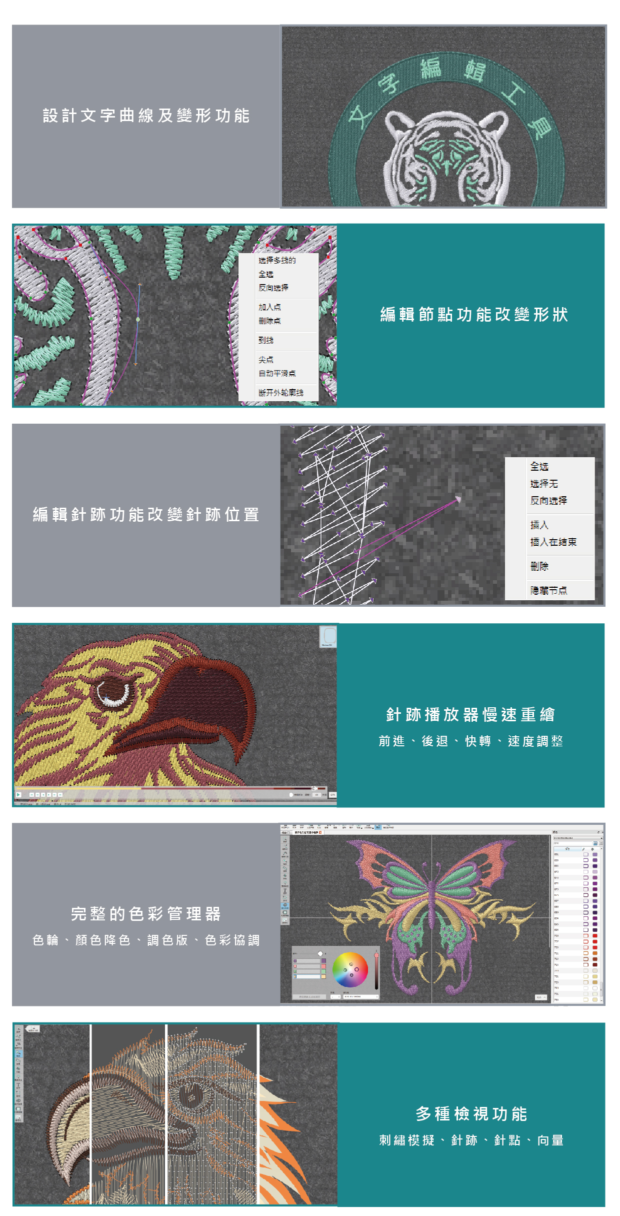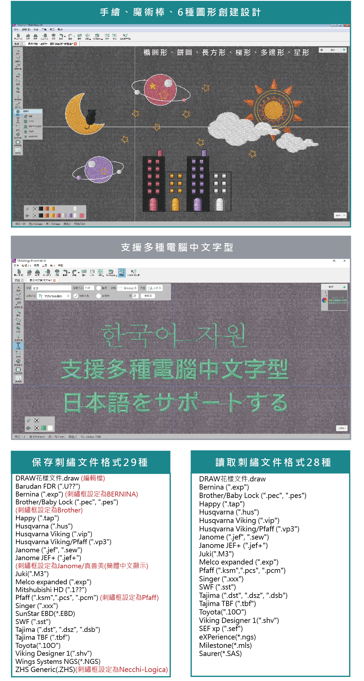 ●支援各大廠牌刺繡機 ●支援儲存、讀取多種檔案格式
