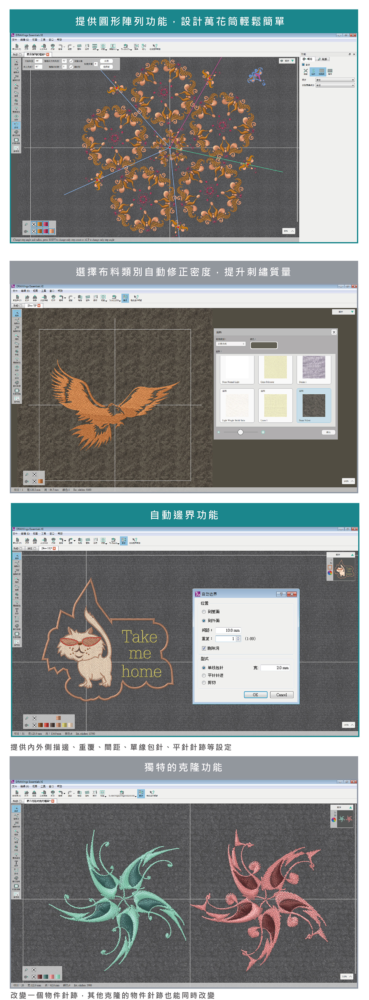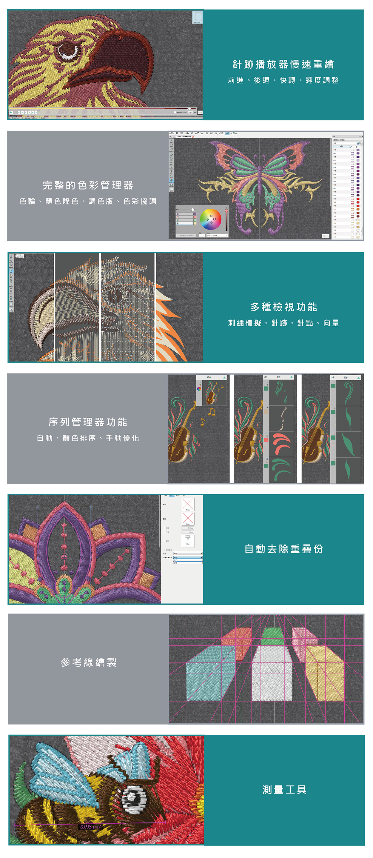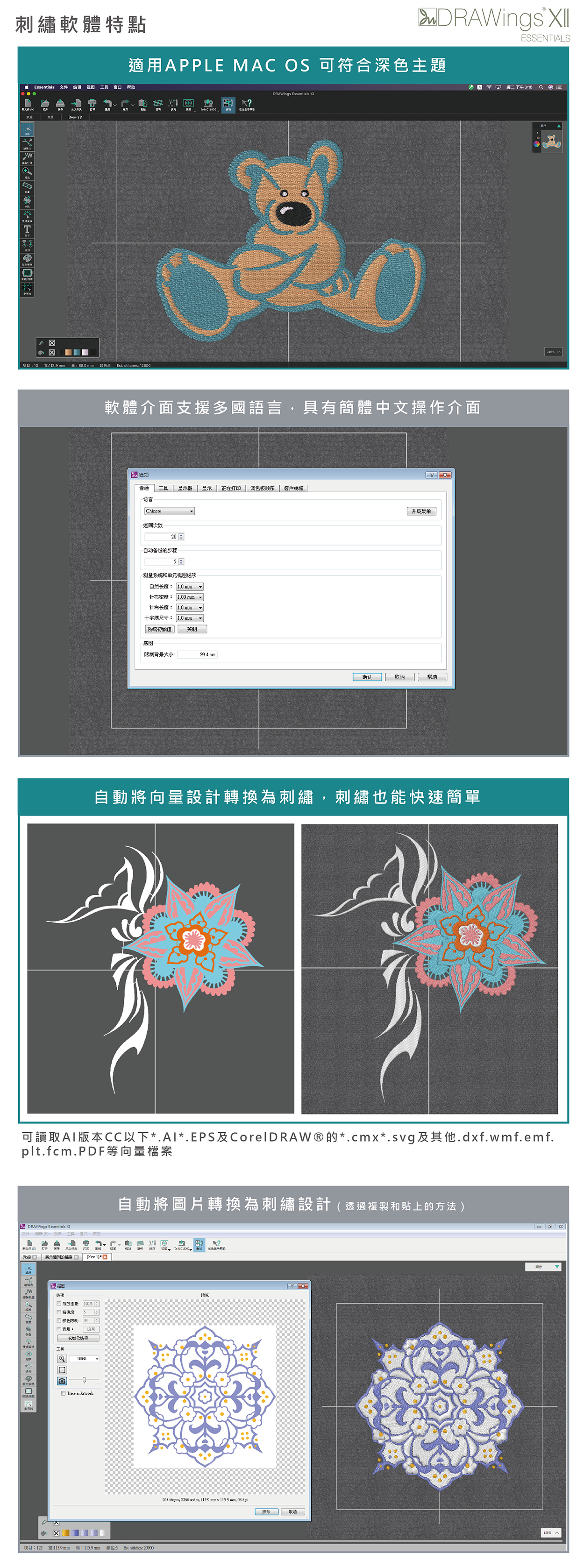 ●支援各大廠牌刺繡機 ●支援儲存、讀取多種檔案格式