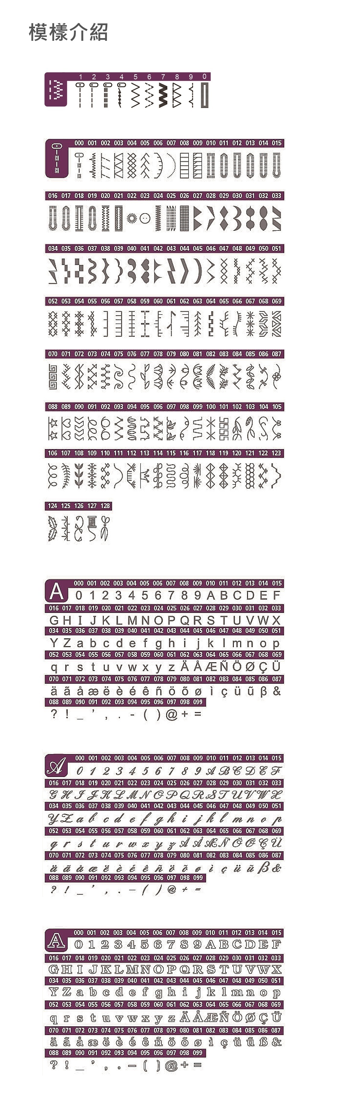 多達439種車縫模樣,內含3款英數字型(印刷體、書寫體、中空體)。