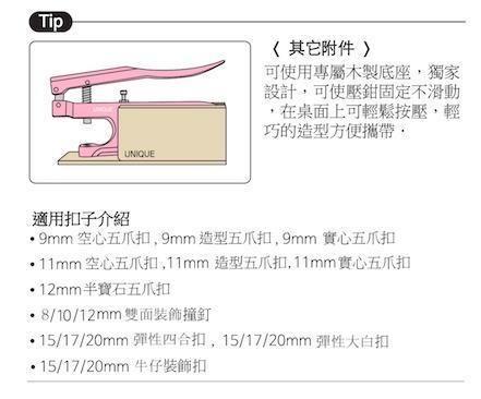 韓國UNIQUE推出的粉色手壓鉗,除了塑膠與金屬四合扣,更換模具還能打裝飾釘、牛仔扣、五爪扣、大白扣…等。