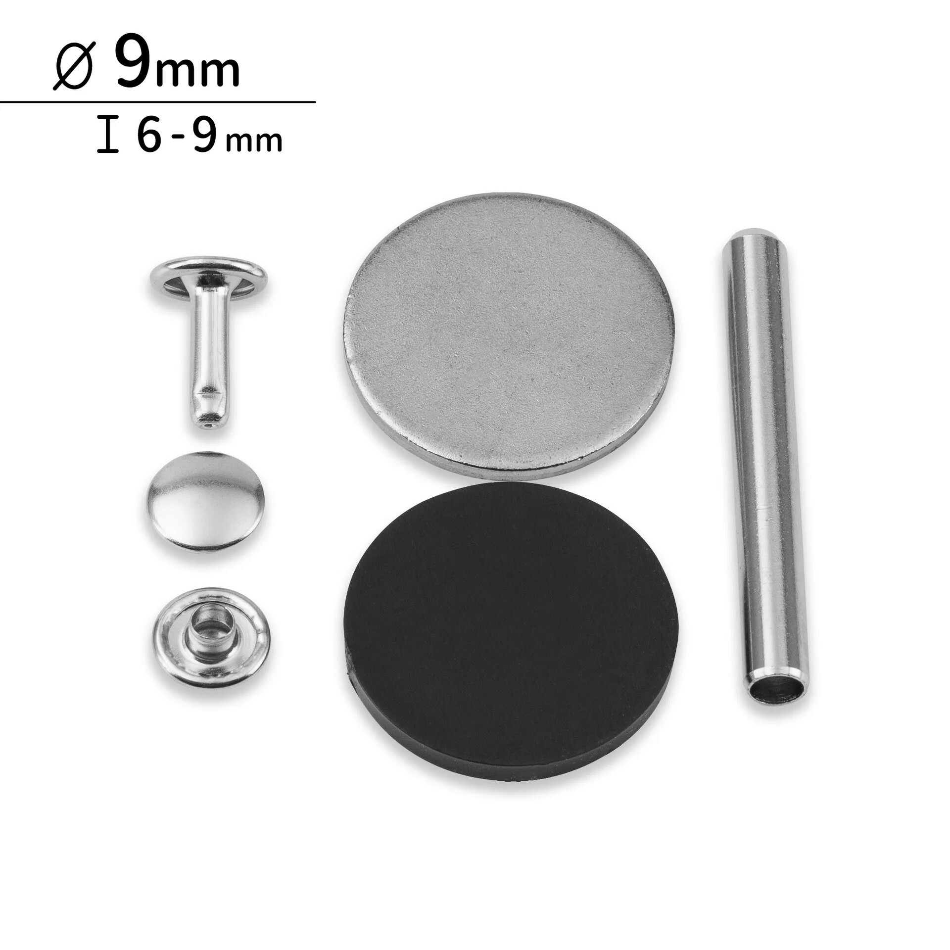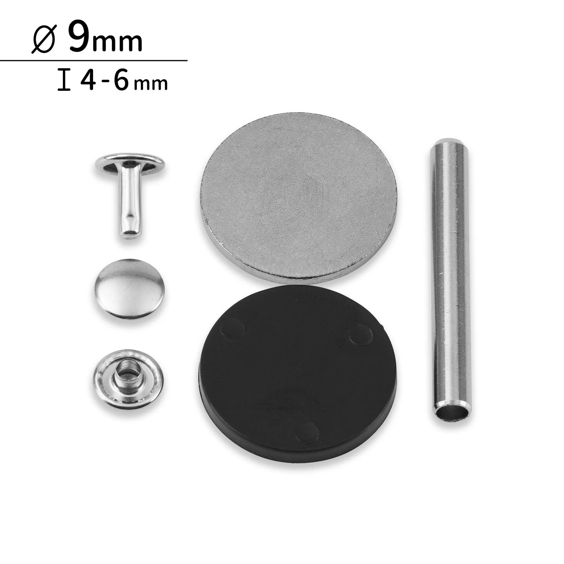 尺寸差異在於頭部的直徑以及銷釘的長度,銷釘越長,待鉚接的材料可以越厚,例如皮革。